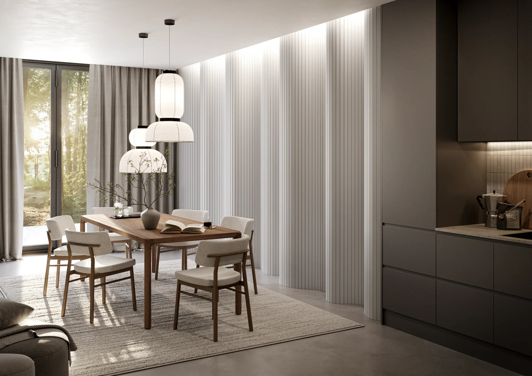 Lamellene tilpasses enkelt mot hverandre, slik at du får et jevnt og helhetlig resultat. Med Puzzle-lameller kan du også forme subtile bølger og myke linjer som gir rommet mer dybde og et unikt uttrykk.